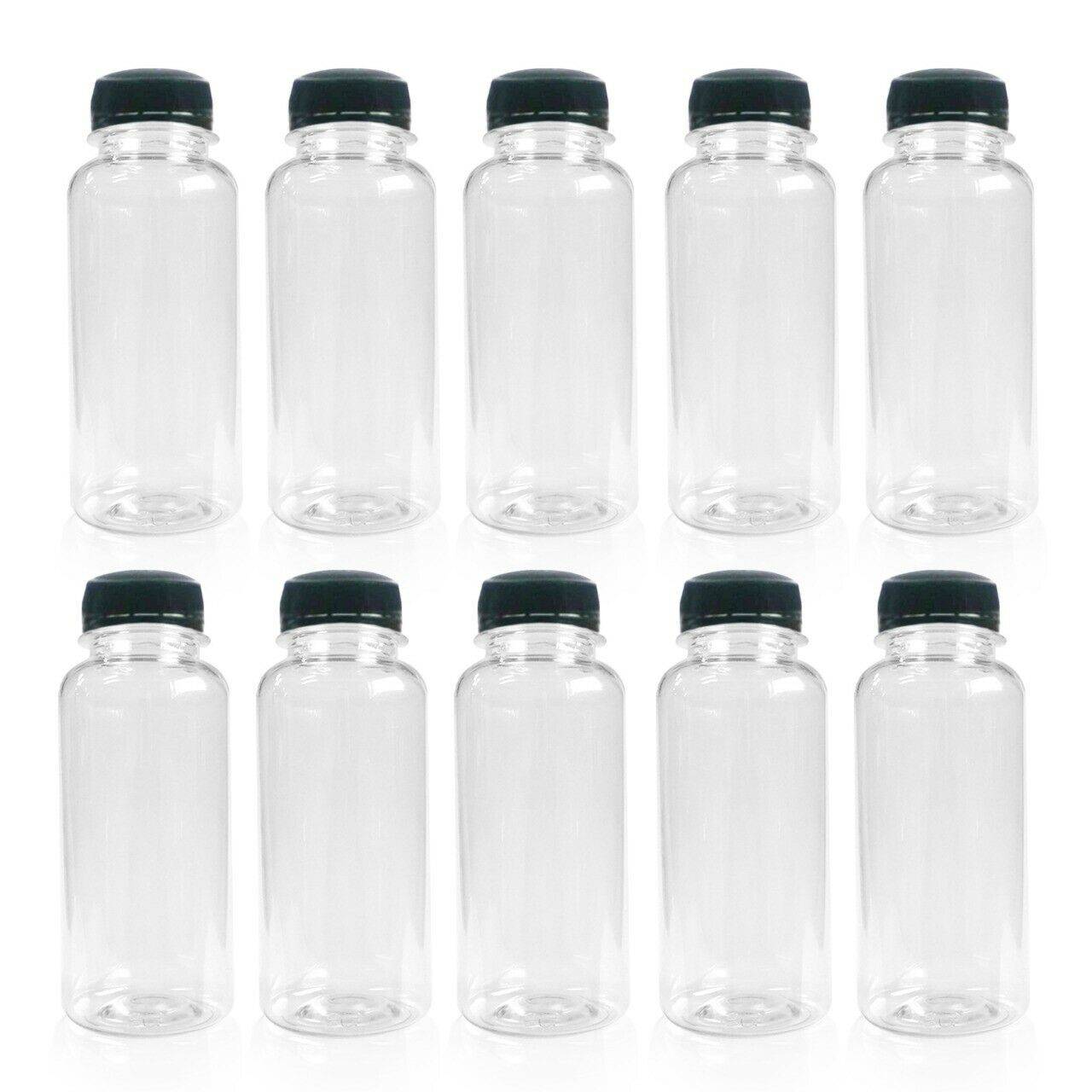 This 250 ml PET Plastic Juice Bottles - Reusable Clear Disposable Water & Juice bottles comes with Black Tamper Evident Caps in a bundle of 20pcs.