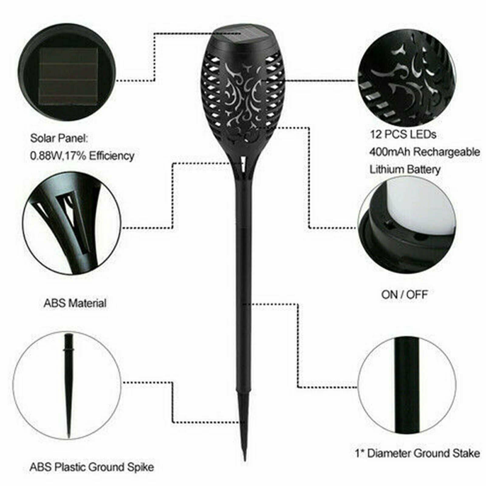 - Gorgeous Flickering Flames: Solar Torches flicker a gorgeous dancing flames, a safe alternative to the real flames. Through Upgraded 12LEDs, it casts a safe, soft and mood-enhancing glow.
