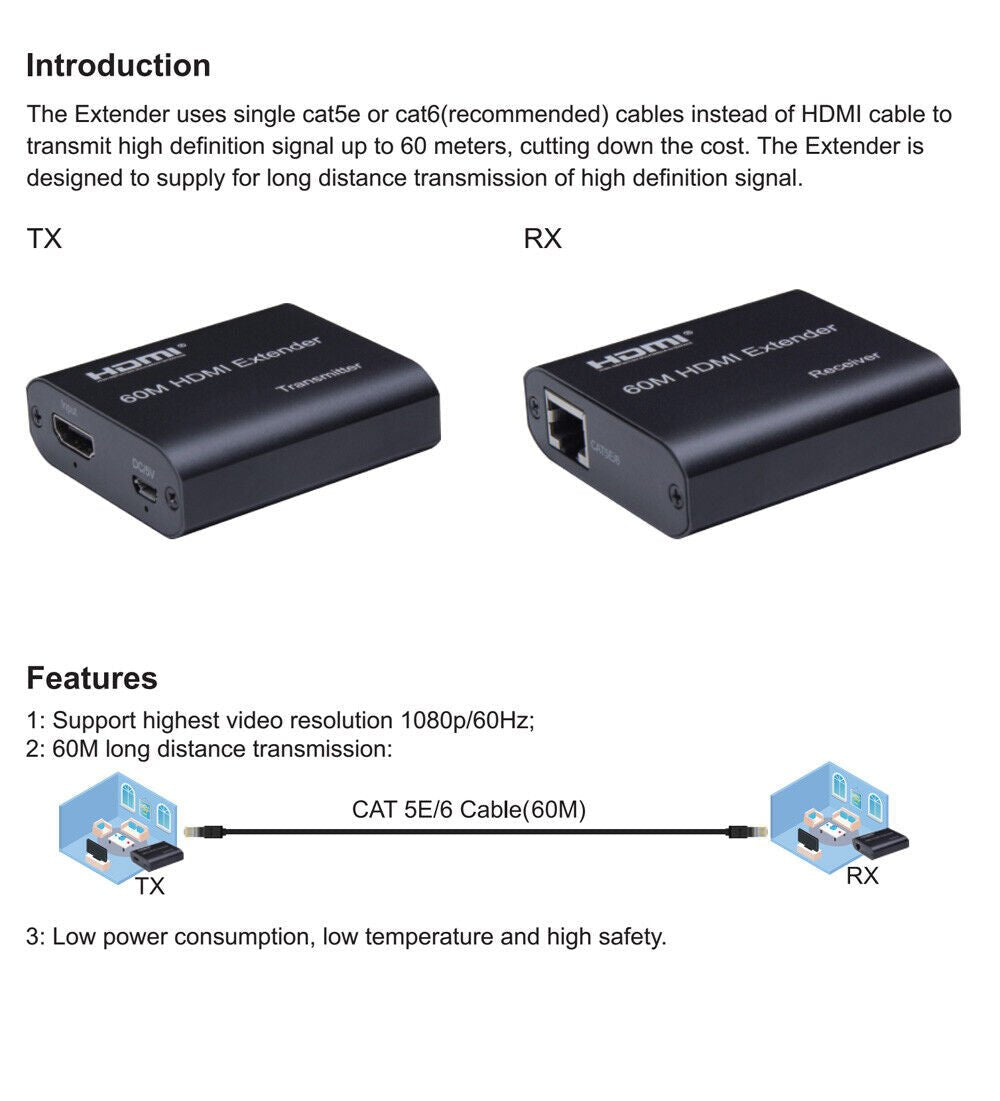 HDMI Extender over Single Network cat5e/6 RJ45 Ethernet Cable up 60m PC Laptop