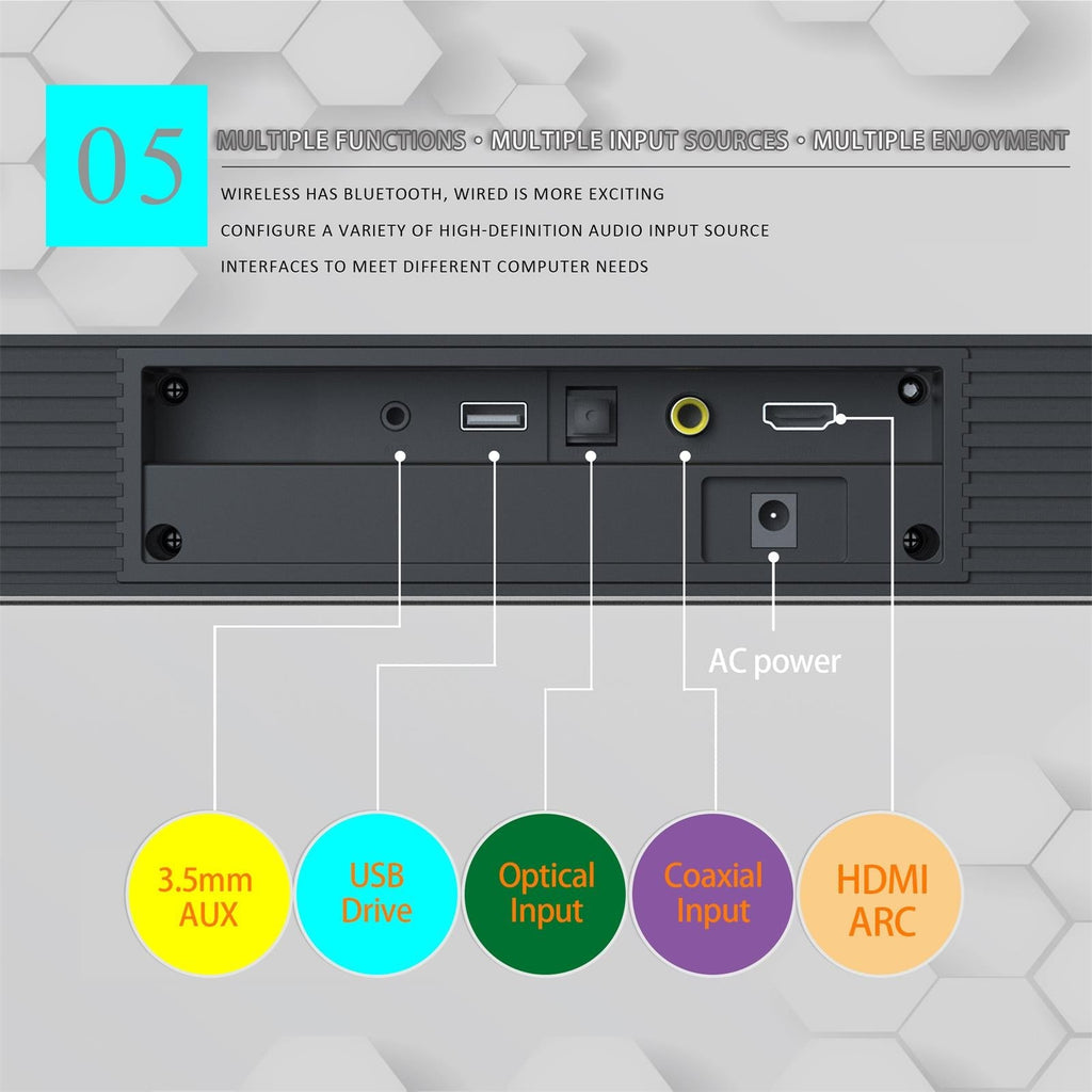5. Audio Input: Bluetooth, HDMI(ARC),Optical, Coaxial 3.5mm Aux, USB